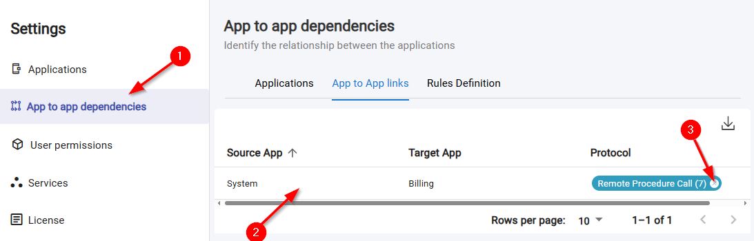 The App to App Dependencies view displays the relationships between analyzed applications, focusing on remote calls and shared resource access. This visualization can help users understand how applications communicate and identifies potential gaps in these connections.