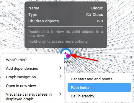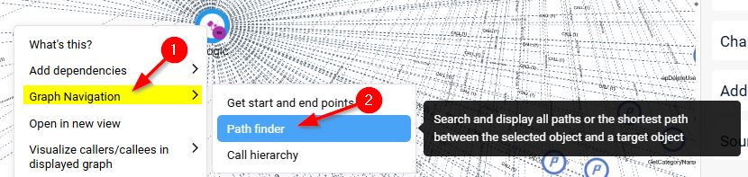 Take the following example where the selected source object is a C# class and we want to find the shortest path between this object and another C# class calling the source object:
