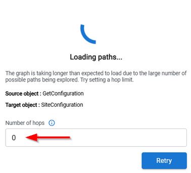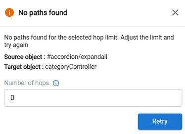 If more than 10 seconds elapses after the start of the path search (whatever the number of hops chosen), a dialog will be displayed providing the opportunity to change the hop value (i.e. reduce it) to ensure the results are displayed in a timely fashion: