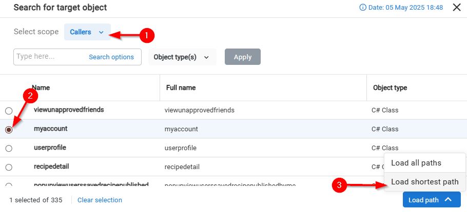 Select the Callers path type, the object you are interested in, then choose Load shortest path: