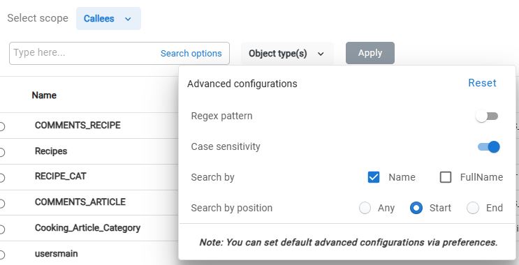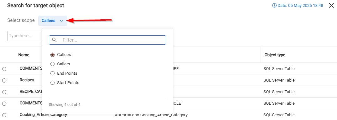 - Callees (default): objects identified as callees for the selected object (i.e. being called by it)