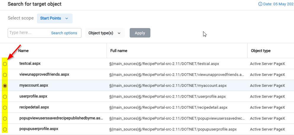 A list of matching objects will be displayed for each type (none will be displayed if no objects match) allowing you to select the object you are interested in via the radio button: