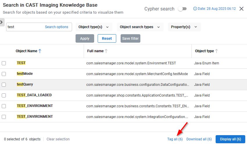 Similar to the Display/Download options, Tag selected/Tag all options are available for the objects that match your search criteria.