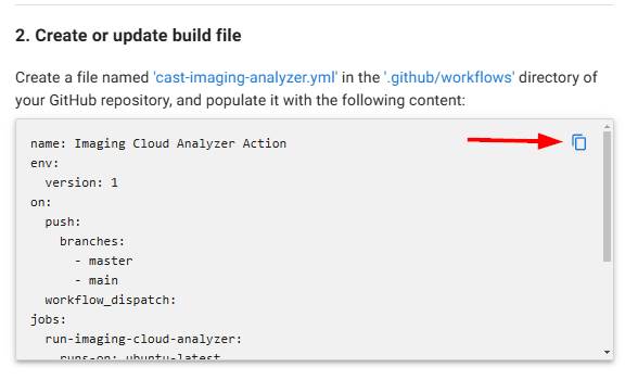 In your GitHub account, navigate to the Code tab and create a GitHub Actions build file called cast-imaging-analyzer.yml in .github/workflows in the main or master branch: