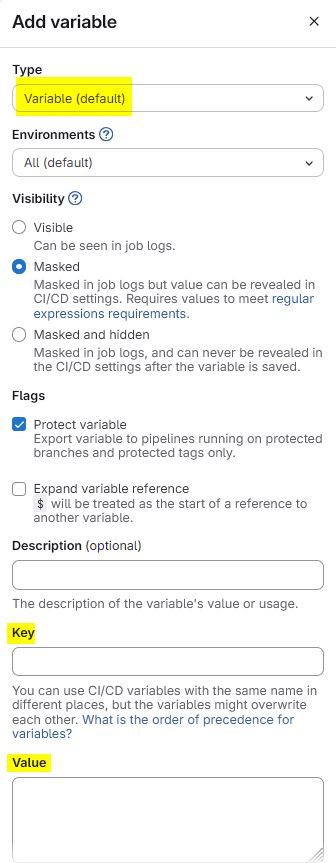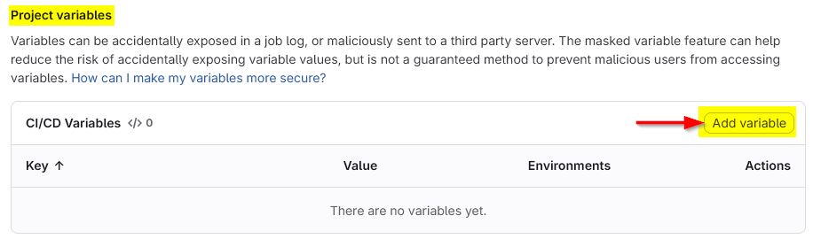 In your Gitlab account, navigate to the repository containing your application source code, then Settings > CI/CD > Variables > Add variables: