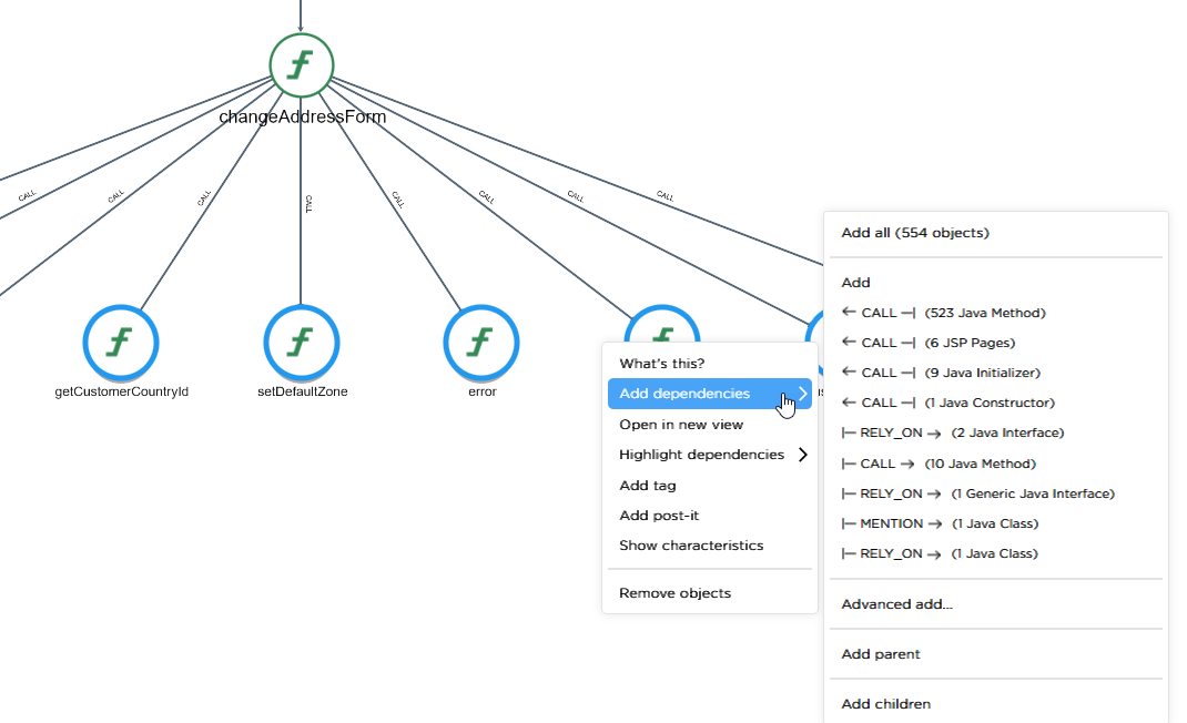 CAST Imaging Express offers additional methods for investigating object dependencies - these are all designed to function on objects that are already present in a view, in whichever way that view has been created (i.e. from search results, drill down, expand etc.):