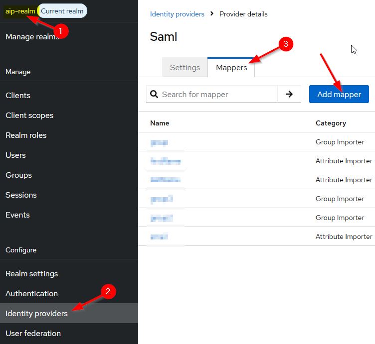 For each group that you created previously, you will need to configure a mapper specifically to synchronize the IDP group with the Keycloak group. To do so click the Mappers tab in your SAML User Federation setting and click Add mapper: