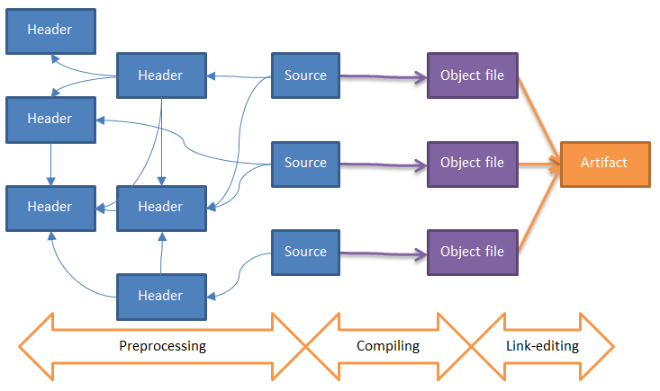 - Source code preprocessing: Each source code file (.c, .cpp, .cxx, .cc…) is processed to include additional lines of code coming from other files (typically header files: .h, .hh, .hpp, .tpp, .inl) and to generate the complete source code, aka the preprocessed source file. Note that a header file can be included in other header files.