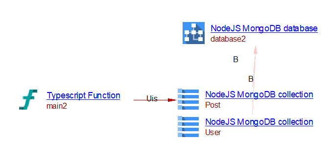 In this example, a ‘NodeJS MongoDB connection’ and two ‘NodeJS MongoDB collection’ objects are created. This extension creates a ‘useInsert’ and a ‘useSelect’ links from the function ‘main2’ to the collection ‘Post’: